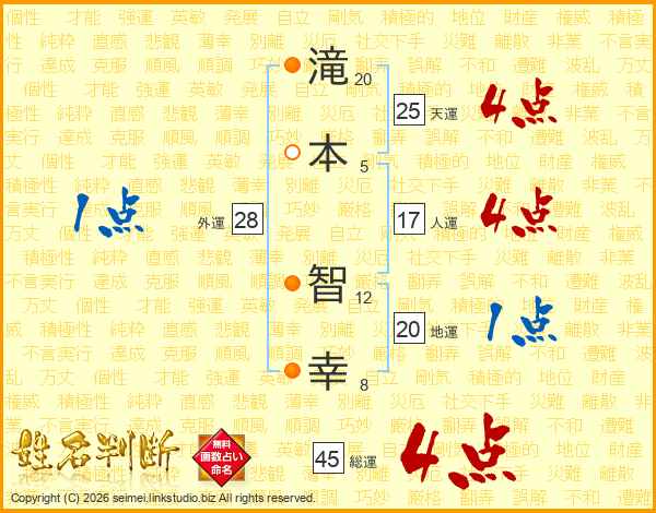 滝(20画)本(5画) 智(12画)幸(8画)