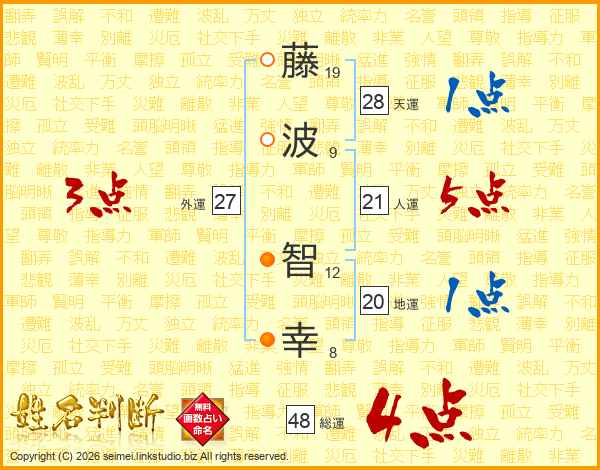 藤(19画)波(9画) 智(12画)幸(8画)