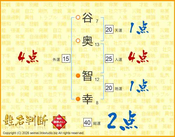谷(7画)奥(13画) 智(12画)幸(8画)