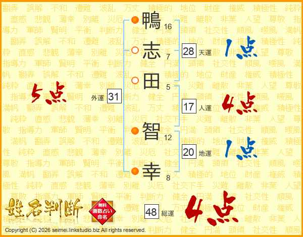 鴨(16画)志(7画)田(5画) 智(12画)幸(8画)