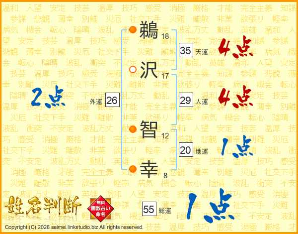 鵜(18画)沢(17画) 智(12画)幸(8画)