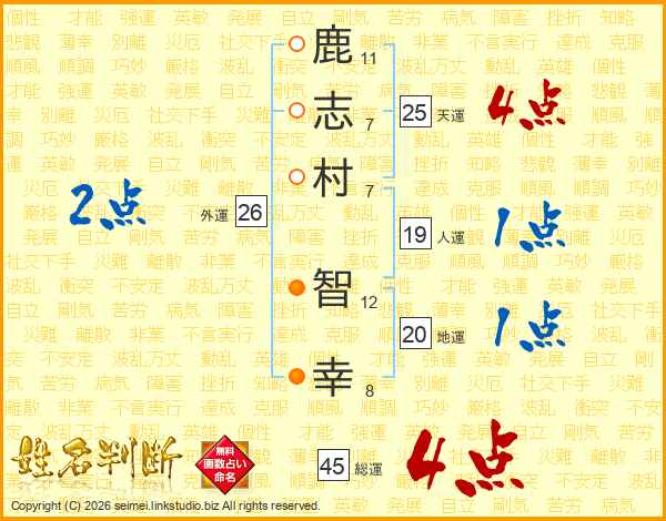 鹿(11画)志(7画)村(7画) 智(12画)幸(8画)