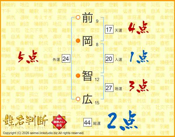 前(9画)岡(8画) 智(12画)広(15画)
