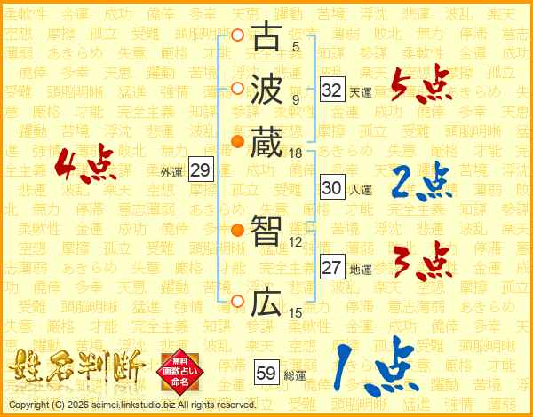 古(5画)波(9画)蔵(18画) 智(12画)広(15画)