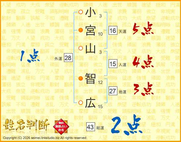 小(3画)宮(10画)山(3画) 智(12画)広(15画)