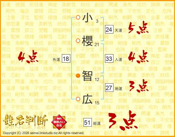 生活面を象徴する運勢です。外部から受ける影響力を表し、結婚運、家庭運や職場、環境への順応性を表します。総運から人運を引いた画数。姓や名が1文字の場合を除く。