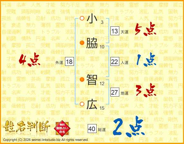 小(3画)脇(10画) 智(12画)広(15画)