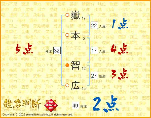 嶽(17画)本(5画) 智(12画)広(15画)