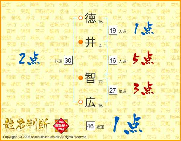 あなたの人生を表す1番重要な運勢です。生涯を通じて影響する総合運となり、主に50歳以降の晩年期に影響を及ぼします。苗字と名前の合計画数。