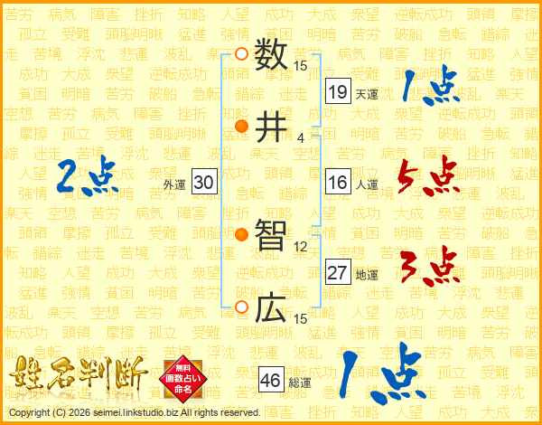 数(15画)井(4画) 智(12画)広(15画)