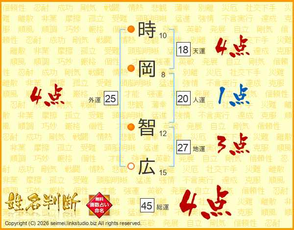 時(10画)岡(8画) 智(12画)広(15画)