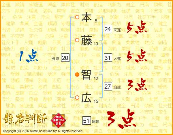 本藤智広さんの人運は31画の5点!