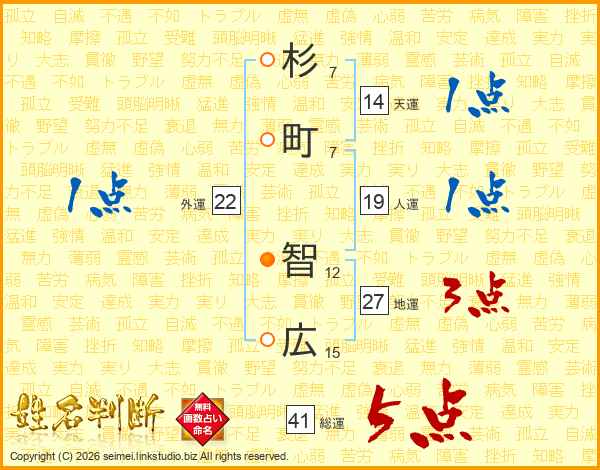 杉(7画)町(7画) 智(12画)広(15画)