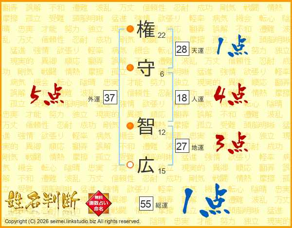 生活面を象徴する運勢です。外部から受ける影響力を表し、結婚運、家庭運や職場、環境への順応性を表します。総運から人運を引いた画数。姓や名が1文字の場合を除く。