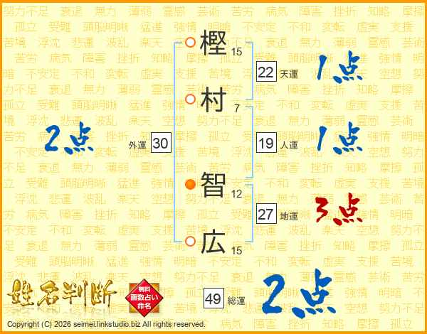 樫(15画)村(7画) 智(12画)広(15画)