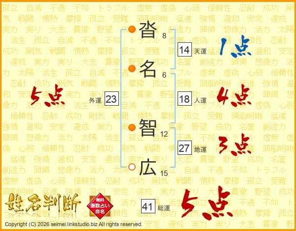 沓(8画)名(6画) 智(12画)広(15画)