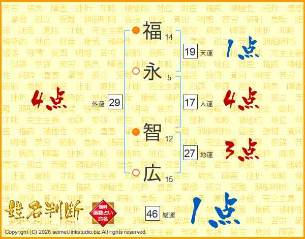 生活面を象徴する運勢です。外部から受ける影響力を表し、結婚運、家庭運や職場、環境への順応性を表します。総運から人運を引いた画数。姓や名が1文字の場合を除く。