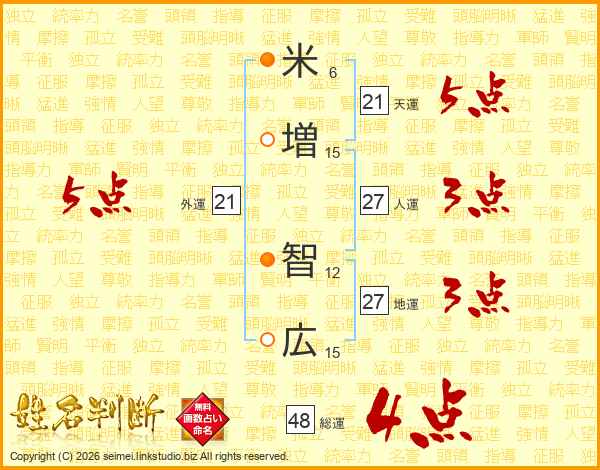 米(6画)増(15画) 智(12画)広(15画)
