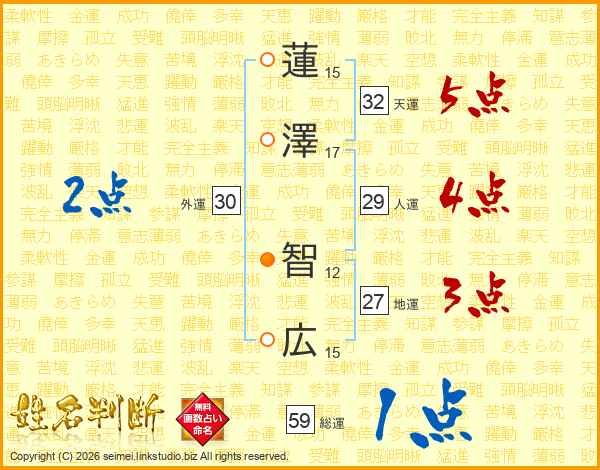 蓮(15画)澤(17画) 智(12画)広(15画)