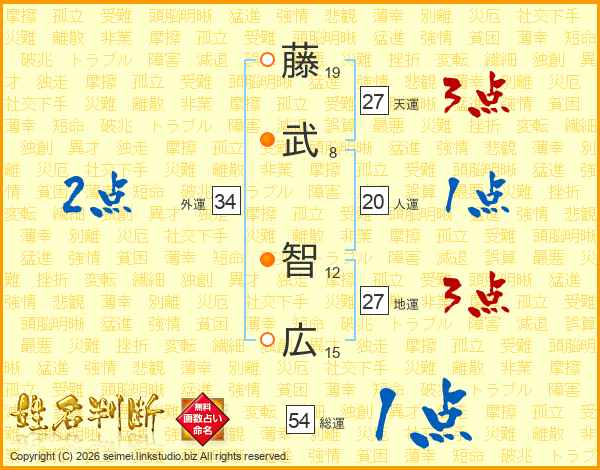 生活面を象徴する運勢です。外部から受ける影響力を表し、結婚運、家庭運や職場、環境への順応性を表します。総運から人運を引いた画数。姓や名が1文字の場合を除く。
