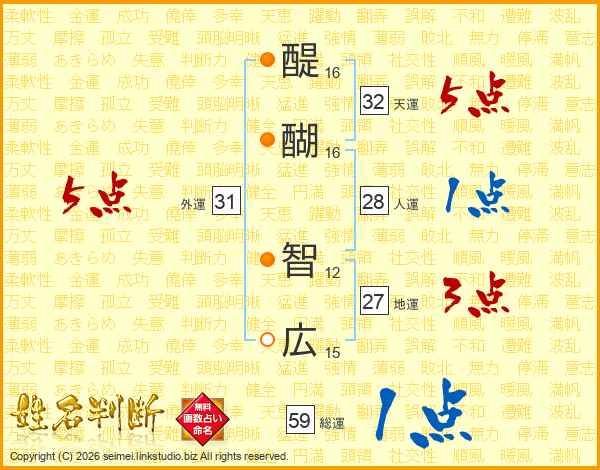 生活面を象徴する運勢です。外部から受ける影響力を表し、結婚運、家庭運や職場、環境への順応性を表します。総運から人運を引いた画数。姓や名が1文字の場合を除く。