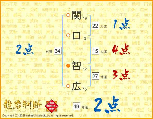 関(19画)口(3画) 智(12画)広(15画)