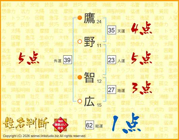鷹(24画)野(11画) 智(12画)広(15画)