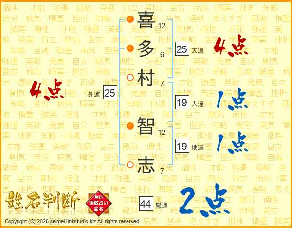 喜(12画)多(6画)村(7画) 智(12画)志(7画)