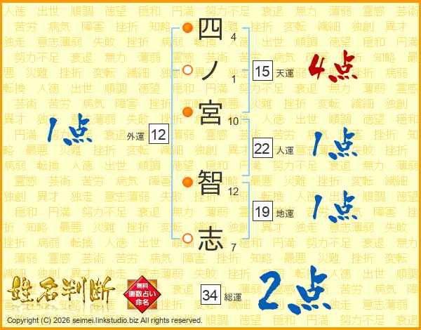 四(4画)ノ(1画)宮(10画) 智(12画)志(7画)