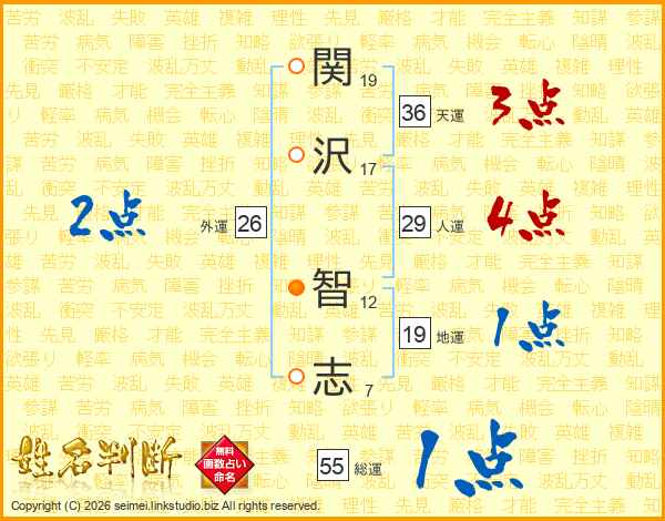 関(19画)沢(17画) 智(12画)志(7画)