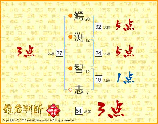 鰐渕智志さんの天運は32画の5点!