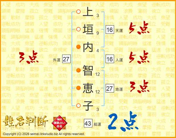 上(3画)垣(9画)内(4画) 智(12画)恵(12画)子(3画)