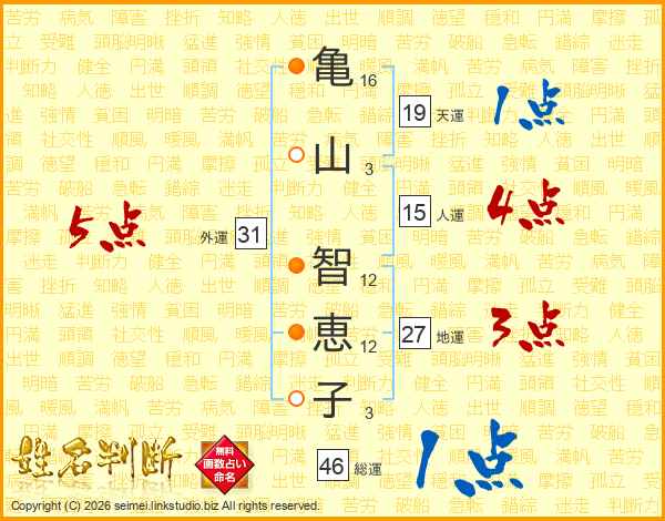 亀(16画)山(3画) 智(12画)恵(12画)子(3画)