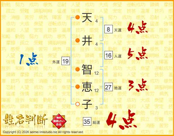 天(4画)井(4画) 智(12画)恵(12画)子(3画)