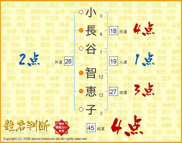 小(3画)長(8画)谷(7画) 智(12画)恵(12画)子(3画)