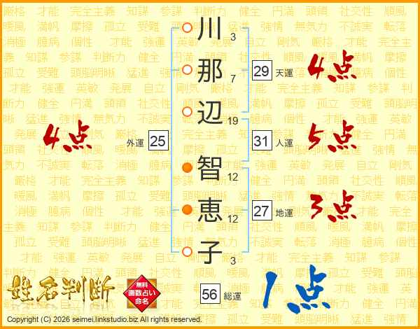 川(3画)那(7画)辺(19画) 智(12画)恵(12画)子(3画)