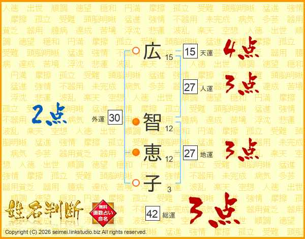 生活面を象徴する運勢です。外部から受ける影響力を表し、結婚運、家庭運や職場、環境への順応性を表します。総運から人運を引いた画数。姓や名が1文字の場合を除く。