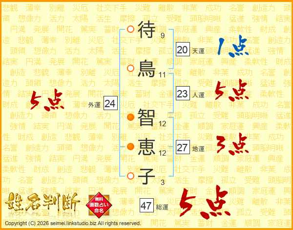 待(9画)鳥(11画) 智(12画)恵(12画)子(3画)