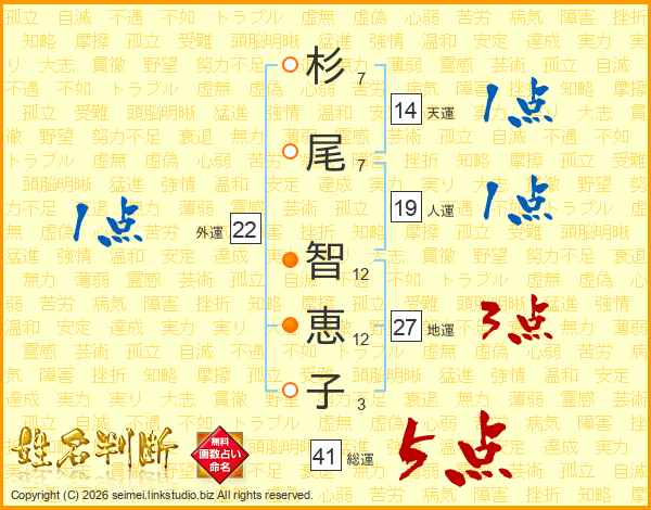 杉(7画)尾(7画) 智(12画)恵(12画)子(3画)