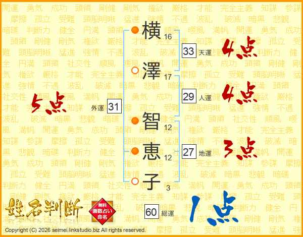 横(16画)澤(17画) 智(12画)恵(12画)子(3画)