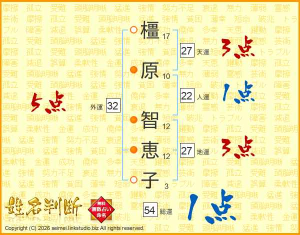橿(17画)原(10画) 智(12画)恵(12画)子(3画)