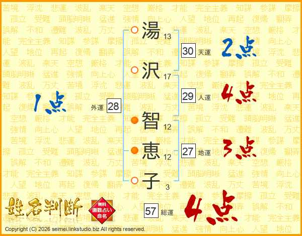 湯(13画)沢(17画) 智(12画)恵(12画)子(3画)
