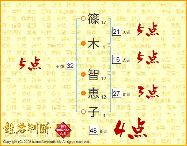 篠(17画)木(4画) 智(12画)恵(12画)子(3画)