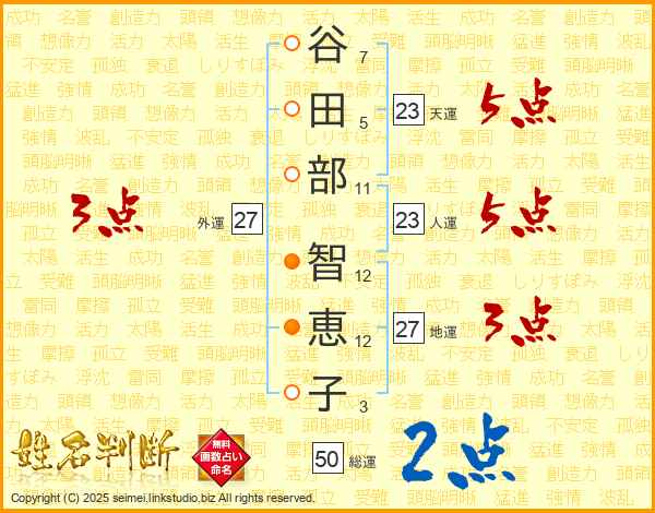 谷(7画)田(5画)部(11画) 智(12画)恵(12画)子(3画)