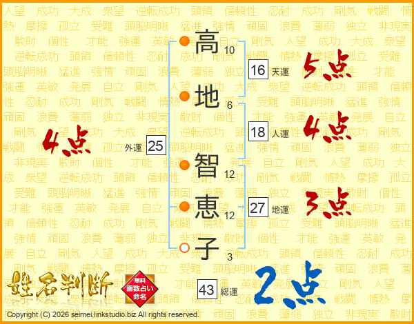 高(10画)地(6画) 智(12画)恵(12画)子(3画)