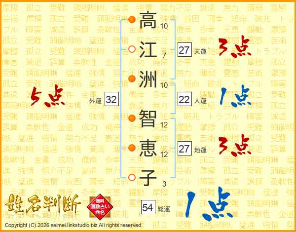 高(10画)江(7画)洲(10画) 智(12画)恵(12画)子(3画)