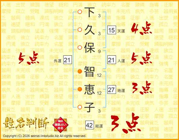 下(3画)久(3画)保(9画) 智(12画)恵(12画)子(3画)