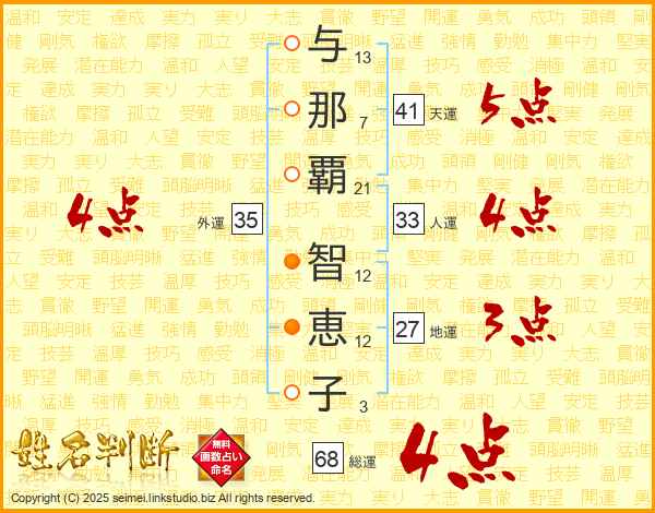 与(13画)那(7画)覇(21画) 智(12画)恵(12画)子(3画)