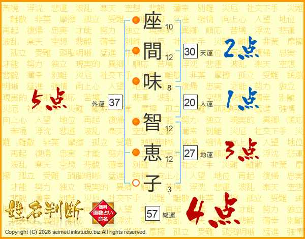 座(10画)間(12画)味(8画) 智(12画)恵(12画)子(3画)