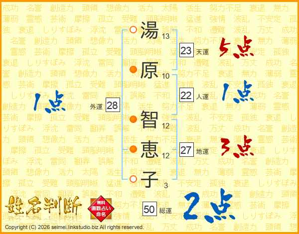 湯(13画)原(10画) 智(12画)恵(12画)子(3画)